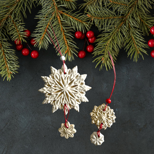 - Elegancki zestaw ceramicznych dekoracji świątecznych. Składa się z 2 podwójnych zawieszek w koronkowych kształcie gwiazdek. Wykonane ręcznie z białej masy ceramicznej, dekorowane białym, błyszczącym szkliwem.