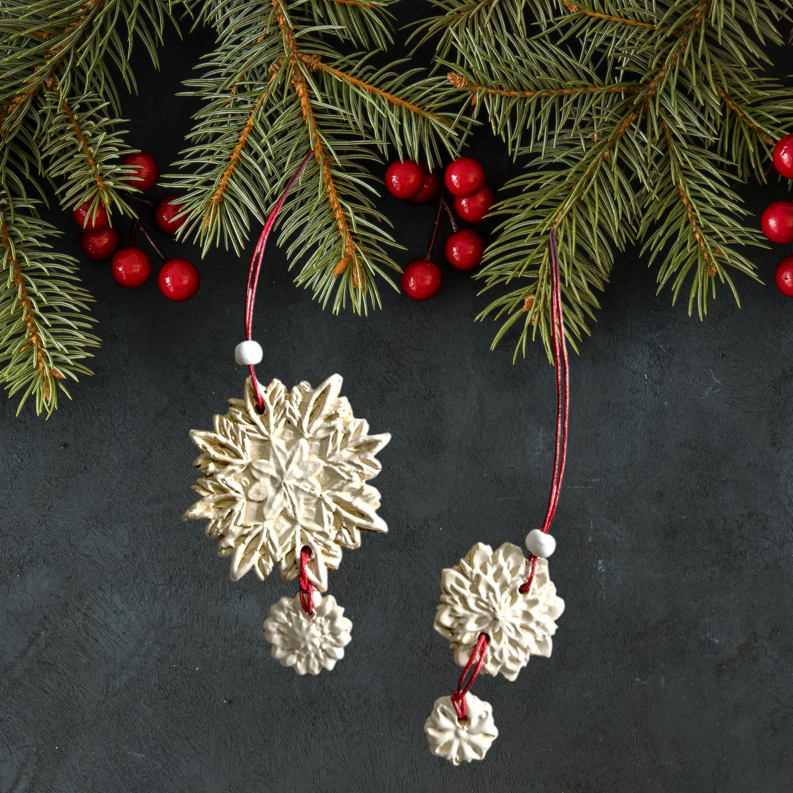 - Elegancki zestaw ceramicznych dekoracji świątecznych. Składa się z 2 podwójnych zawieszek w koronkowych kształcie gwiazdek. Wykonane ręcznie z białej masy ceramicznej, dekorowane białym, błyszczącym szkliwem.
