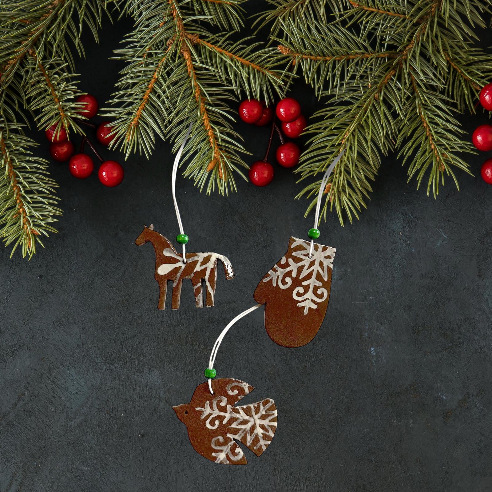 - Elegancki zestaw ceramicznych dekoracji świątecznych. Składa się z 3 zawieszek w kształcie rękawiczki, konika i ptaszka. Wykonane ręcznie z brązowej masy ceramicznej, dekorowane białą angobą oraz przezroczystym, błyszczącym szkliwem.